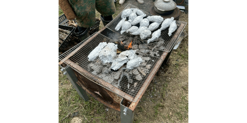 畑で取れたサツマイモを炭火で焼き芋に.