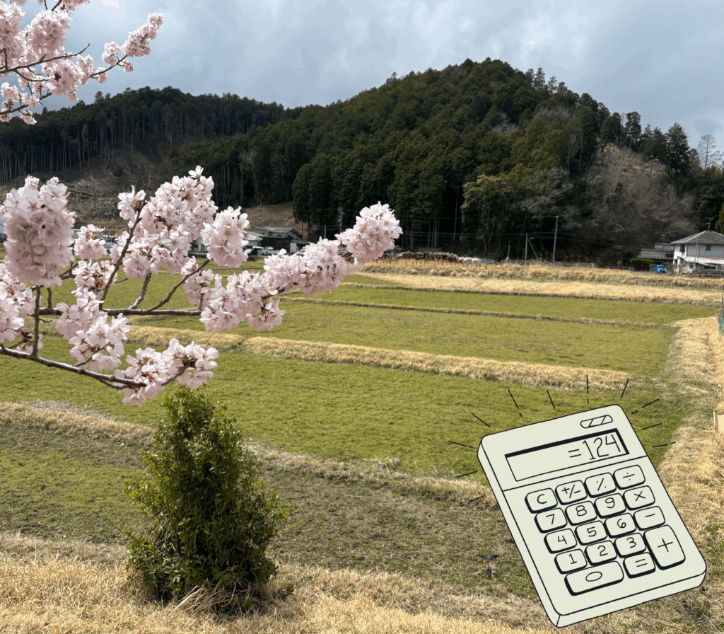 桜が満開の3月30日、耕作地の下見をしました。頭の中には早くも! たわわに実る稲穂のイメージと米の収穫高の皮算用が浮かんできます。 -
